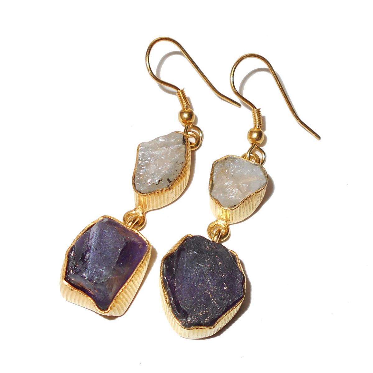 Amethyst, Rainbow moonstone F - RBE977- Crazy fashion style Raw gemstone Earrings with Brass gol