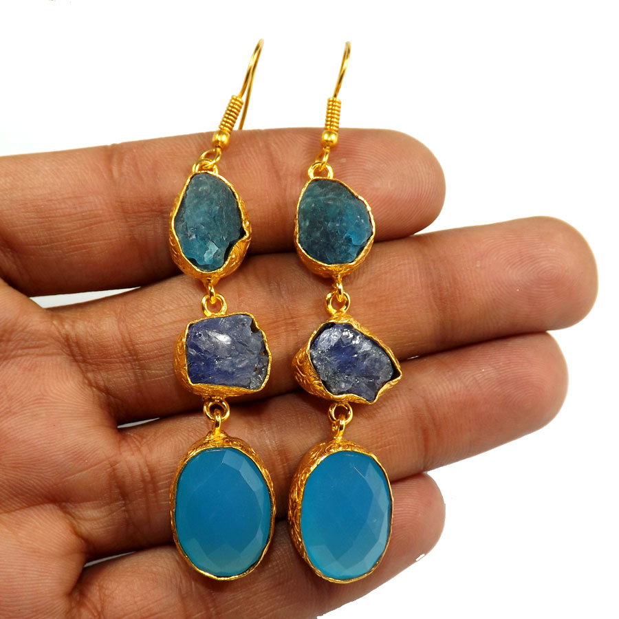 Apatite Rough,Tanzanite Rough & Chalcedony F - PBE954-Three Stone 18ct Gold Plated Brass Earring