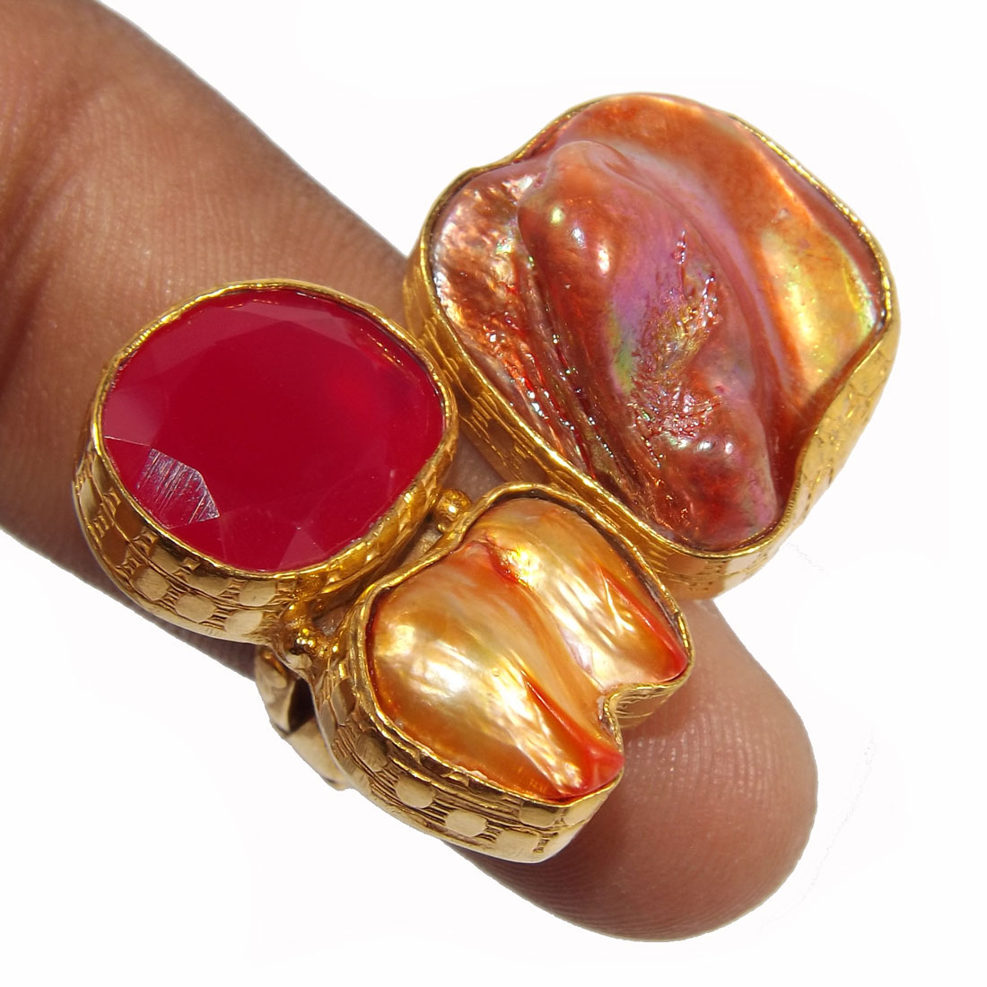 Biwa Pearl & Pink Hydro E - BCR989-Designer Handmade Gold Plated Rough Brass Chunky Rings