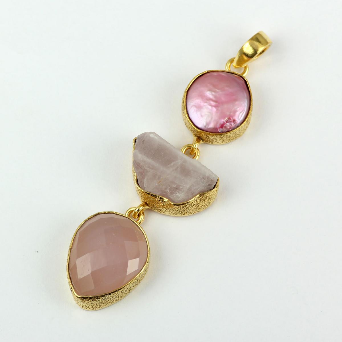 Biwa Pearl,Rose Quartz Rough And Cut A - BCP987-Stunning Designs Gemstones With Gold Plated Rough Brass P