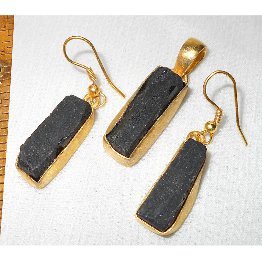Black tourmaline rough A - SET992-Black Tourmaline Pendant & Earring sets with Brass fashio