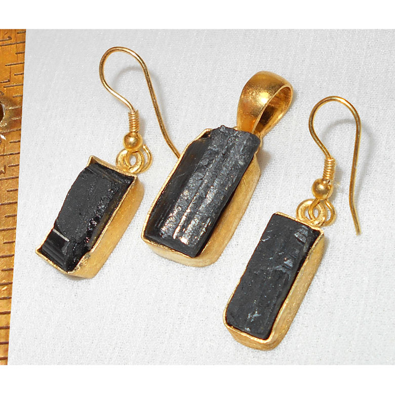 Black tourmaline rough A - SET992-Black Tourmaline Pendant & Earring sets with Brass fashio