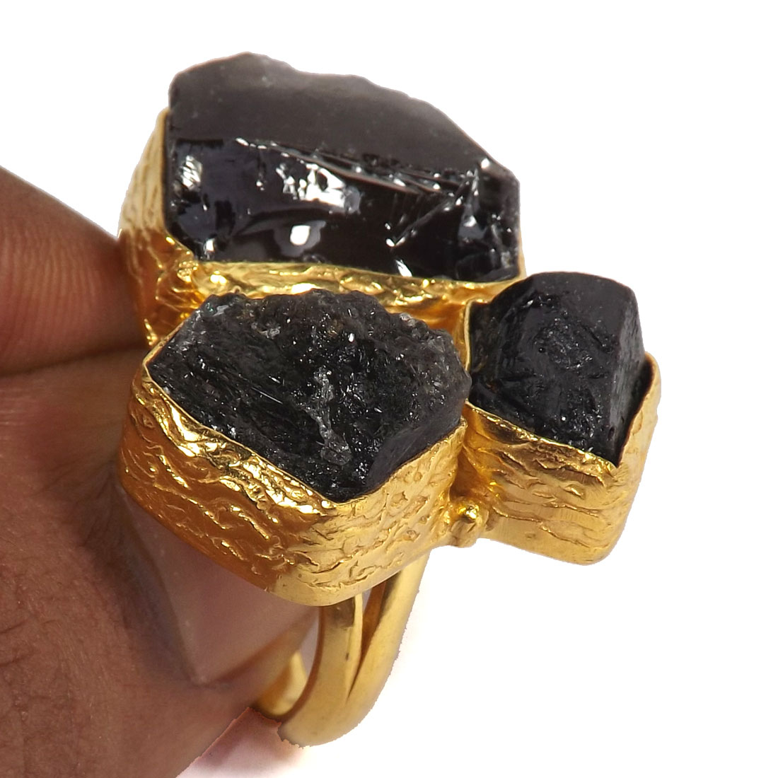 Black Tourmaline & Smokey Rough B - BCR987-Dazzling Designer Gemstone Rough Brass Chunky Rings