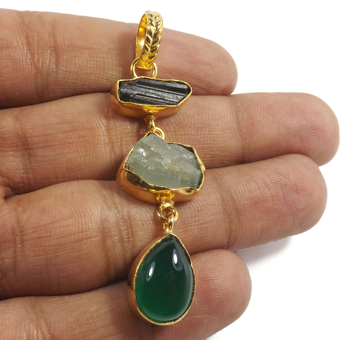 Black Tourmaline,Aquamarine & Green Onyx Cab B - RBJ899-Designer Handmade Three Stone Stylish Rough Brass Pendant