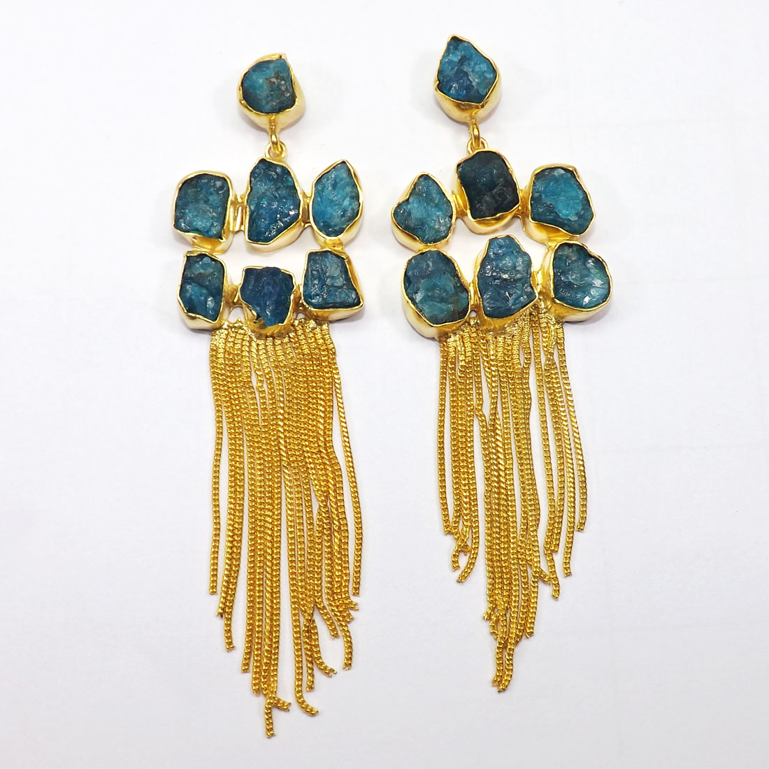 Rough Gemstone Brass with Gold Plated Chain Long Tassel Earrings-PJS997..