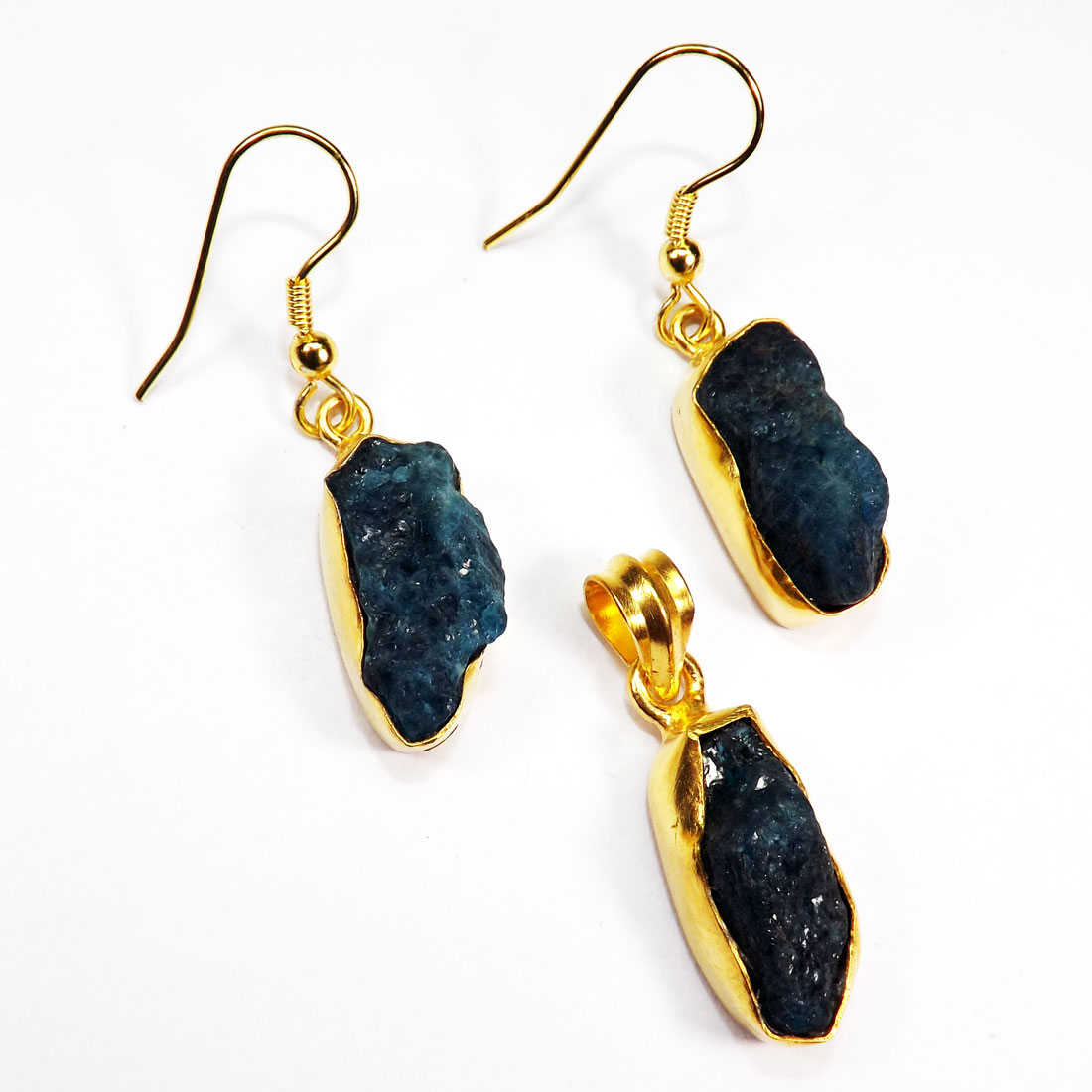 Rough Blue Apatite Gemstone Made in Brass with Gold Plated Vermeil Earring Pendant Set-SET977