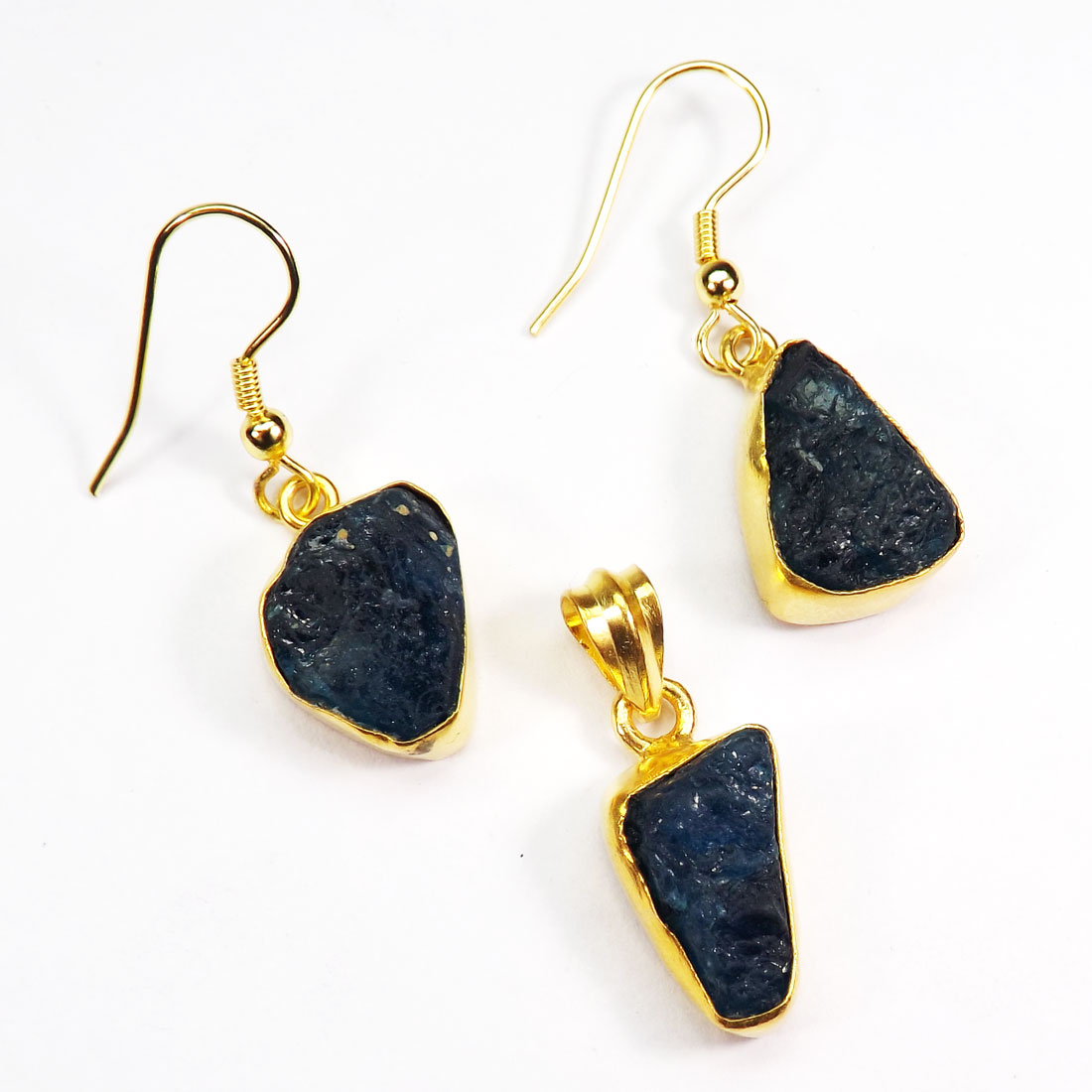 Rough Blue Apatite Gemstone Made in Brass with Gold Plated Vermeil Earring Pendant Set-SET977