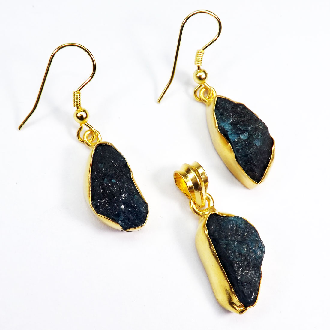Rough Blue Apatite Gemstone Made in Brass with Gold Plated Vermeil Earring Pendant Set-SET977