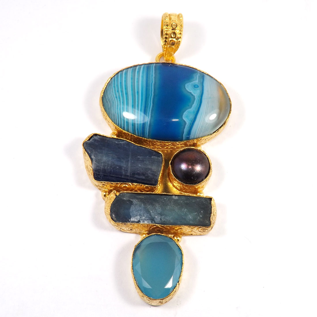Blue Lace Agate,Blue Kynite,Peal & Chalcedony I - CKP987-Amazing New Design Mix Stones Rough Brass Pendants