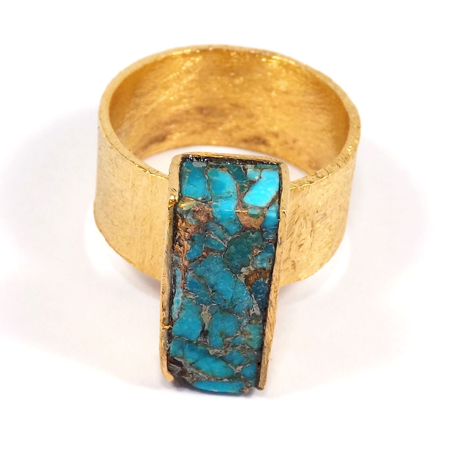 Blue Turquoise G - BRR920-Rough Gemstone With Gold Plated Handmade Brass Ring