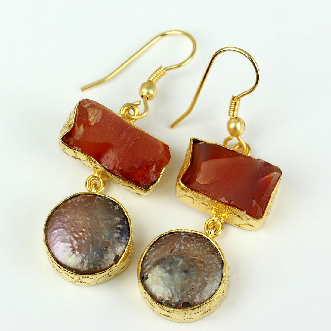 Carnelian And Biwa Pearl O - PBE970-Unique Natural Designer Factory Handmade Rough Brass Earr