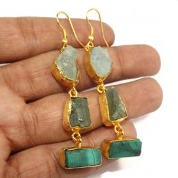 Aquamarine,Fluorite & Malachite F - PBE966-Amazing Designer Three Stone Gold Plating Rough Brass Ear