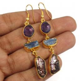 Amethyst,Tanzanite & Pearl G - PBE966-Amazing Designer Three Stone Gold Plating Rough Brass Ear