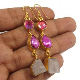 Carnelian,Pink Cab & Rose Quartz - PBE966-Amazing Designer Three Stone Gold Plating Rough Brass Ear