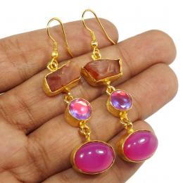 Carnelian,Rainbow Mystic & Pink Cab O - PBE966-Amazing Designer Three Stone Gold Plating Rough Brass Ear