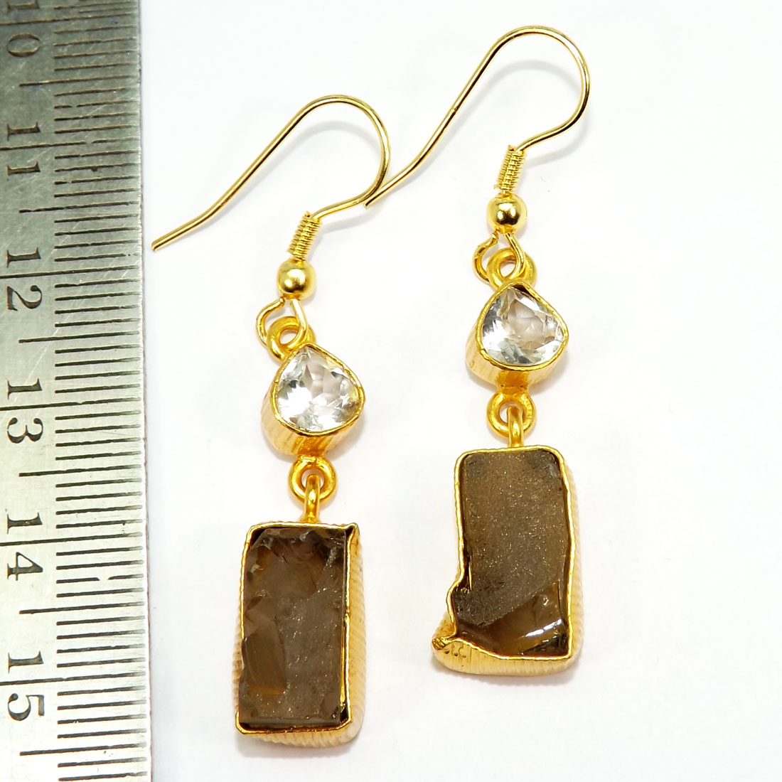 Crystal Cut and Smokey Rough A - PBE984-Handmade Brass Rough Gemstone Unique Earrings