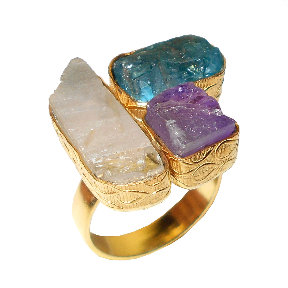 Crystal quartz, Apatite, Amethyst D - RBR944-Stylish fashion Chunky Brass gold vermeil Rings -RBR944