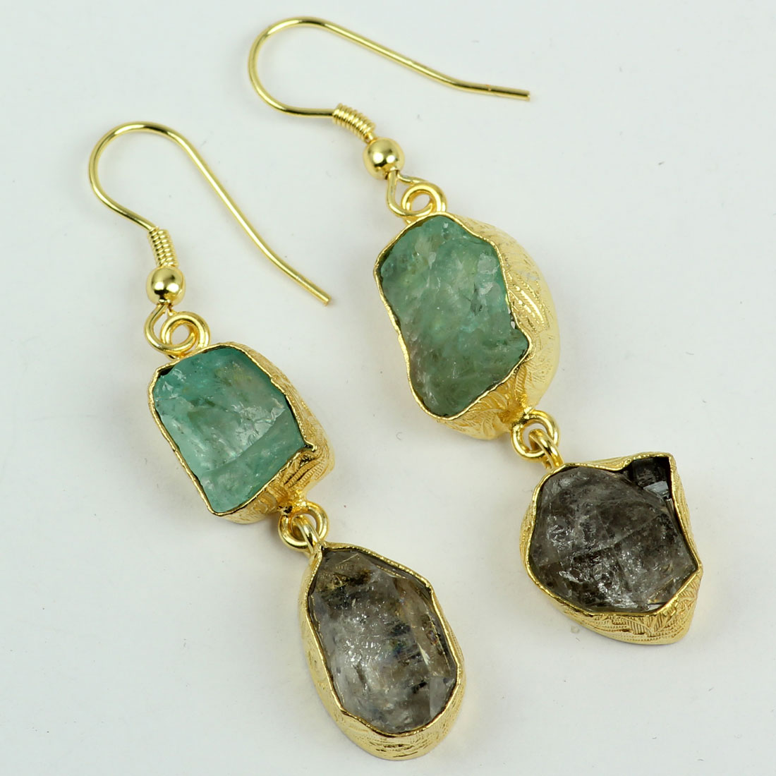 Fluorite And Herkimer Diamond E - PBE973-Stunning Design With Gold Plated Rough Brass Earrings