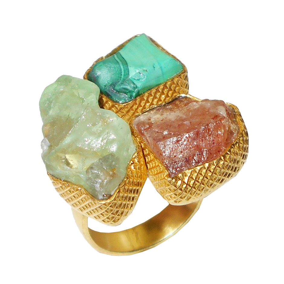 Green fluorite, Sun stone, Malachite A - RBR914- Natural Raw gemstone Rings, Brass gold plated Rings whol