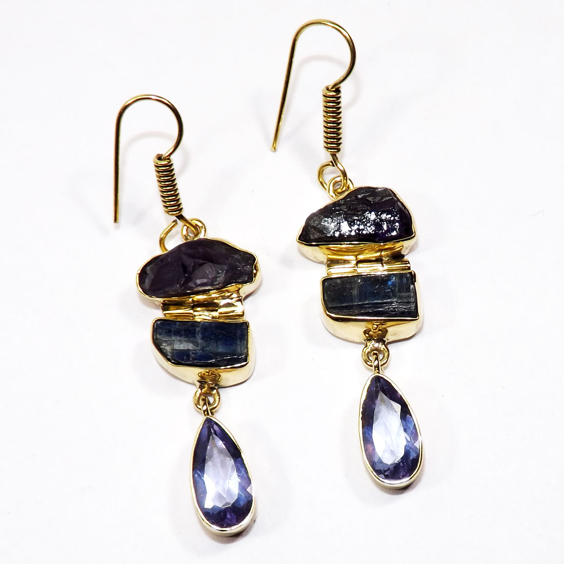 Amethyst Cut Kynite and Tanzanite Rough B - PBE991-Mix Gemstone Made in Brass Earrings