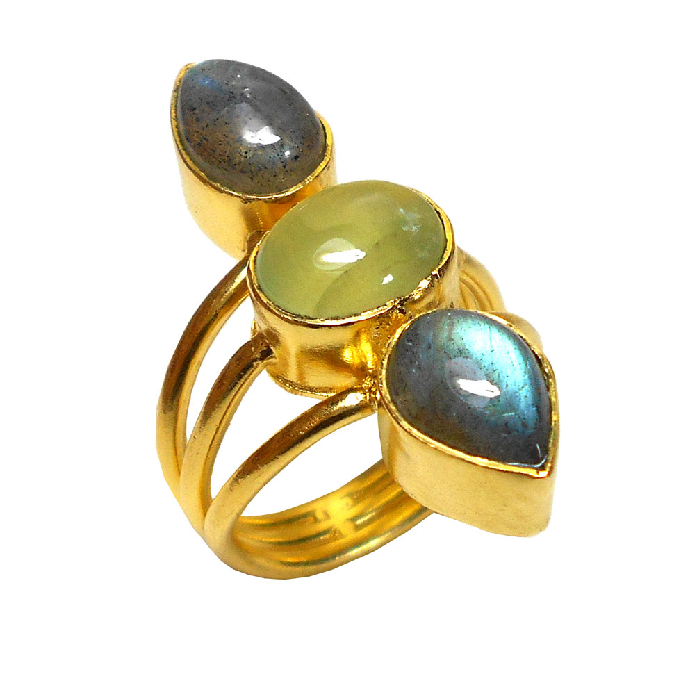 Labradorite, Prehnite cab O - PR972- Handmade Costume fashion gold vermeil Rings with Brass wh
