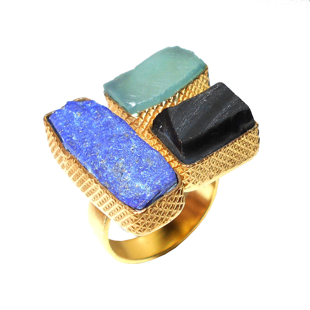 Lapis lazuli, Chalcedony, Black onyx A - RBR963- Raw gemstone Fashion Brass Rings with gold vermeil