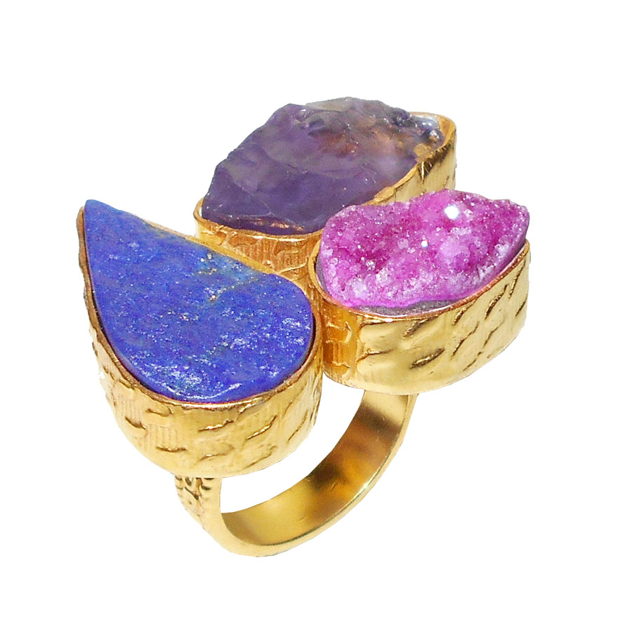 Lapis lazuli, Pink Drusy, Amethyst A - RBR909- Natural Raw gemstone Cluster Rings, Chunky fashion Rings
