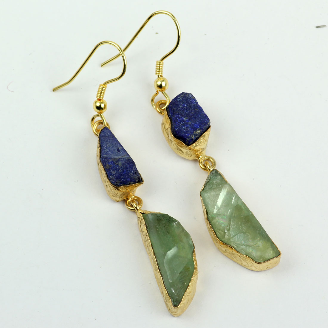 Lpis Lazuli And Fluorite F - PBE973-Stunning Design With Gold Plated Rough Brass Earrings