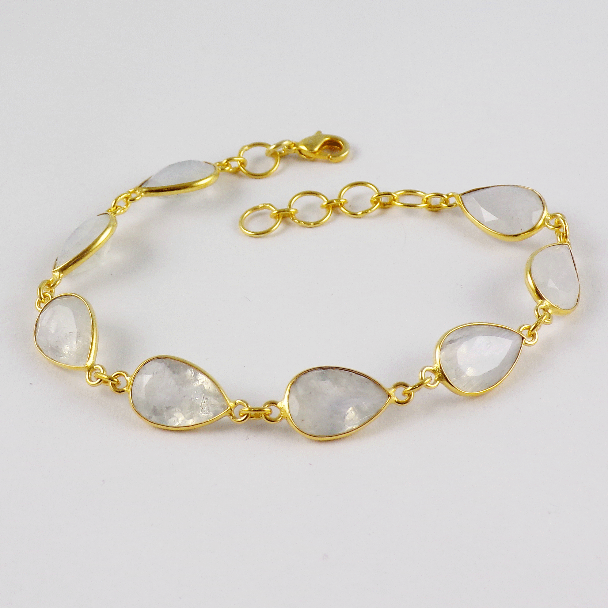 Natural Rainbow Moonstone Brass Bracelet V - BZB999 18K Gold Plated Cut Pear Shape 9x11mm Bezel Setting Brass Bracelet..