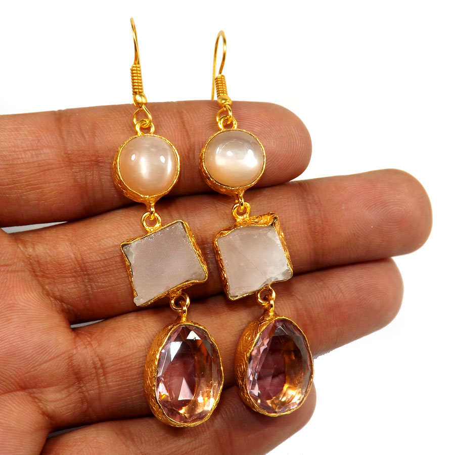 Three Stone 18ct Gold Plated Over Brass Handmade Dangle Earring-PBE954