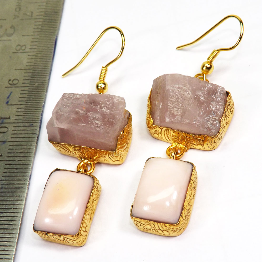 Rose Quartz Rough and Pink Opal Cab B - PBE987-Designer Gemstone Brass with Gold Plated Vermeil Earrings