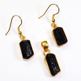 Rough Black Tourmaline Gemstone Made in Brass with Gold Plated Vermeil Earring Pendant Set-SET978