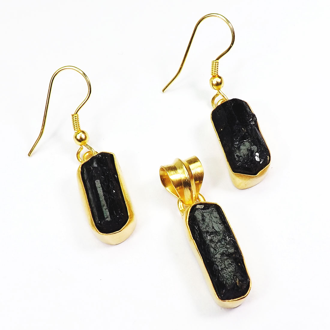 Rough Black Tourmaline Gemstone Made in Brass with Gold Plated Vermeil Earring Pendant Set-SET978