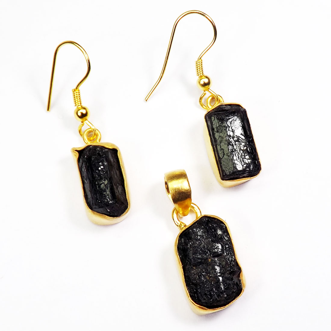 Rough Black Tourmaline Gemstone Made in Brass with Gold Plated Vermeil Earring Pendant Set-SET978..