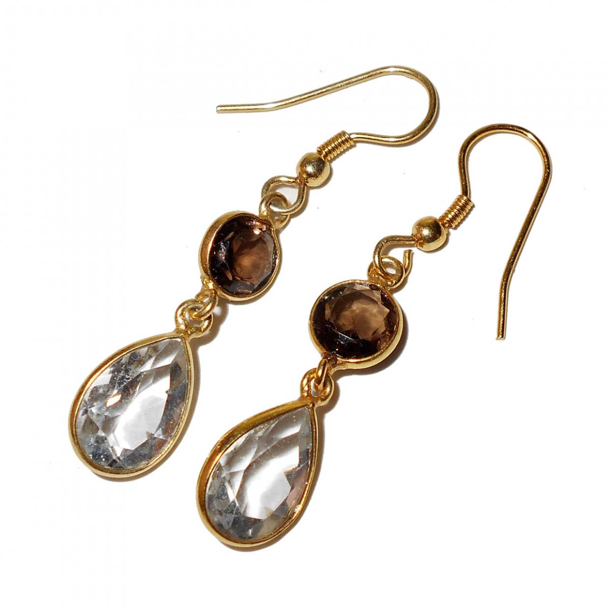 Smokey quartz, Crystal cut E - BJS921- Vintage fashion costume Earrings, Bezel gold vermeil Ear